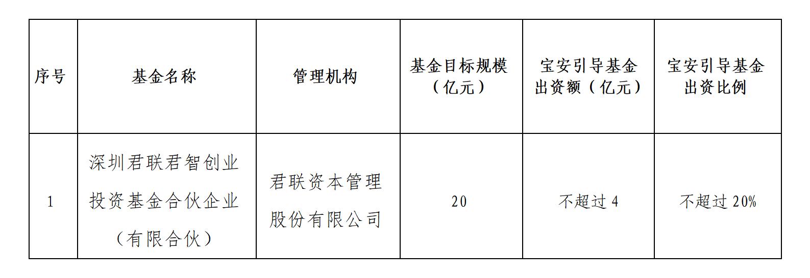 根据《宝安区产业投资引导基金管理办法》的相关规定,深圳市宝安区产业投资引导基金有限公司(以下简称“宝安引导基金”)近期组织召开了投资决策委员会会议,审议了宝安引导基金拟出资的子基金设立方案,现将审议通过的子基金名单予以公示(见附件)。